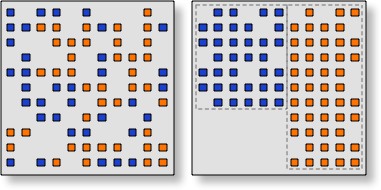 Illustration of floorplanning's effect on placement. Left: blue and orange logic placed automatically. Right: logic floorplanned into blue and orange placement blocks.